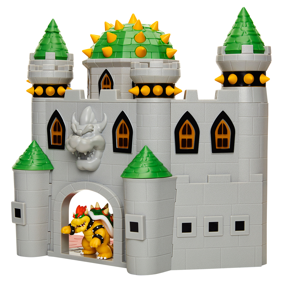 castillo de bowser oficial de la marca Nintendo para niños o niñas, Explore el castillo interactivo de Bowser, pero tenga cuidado con las trampas ocultas que incluyen bolas de fuego giratorias, jaula que se abre, ascensor móvil y trampilla, Suelta a Bowser en la lava accionando la trampilla o presiona la aguja del castillo para activar los sonidos y la música auténticos del juego, usa el elevador para mover a Bowser hacia arriba y hacia abajo hasta el nivel 1 y 2, o gira las bolas de fuego de un lado a otro para una auténtica acción de juego. Incluye una figura exclusiva de Bowser de 2 1/2 pulgadas con 4 puntos de articulación (todas las demás figuras se venden por separado). Se requieren 2 pilas AAA (no incluidas), sugeridas para mayores de 3 años.