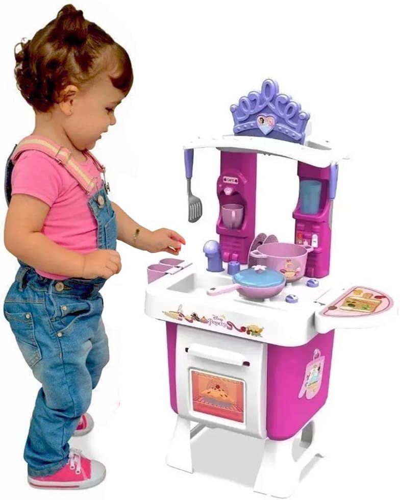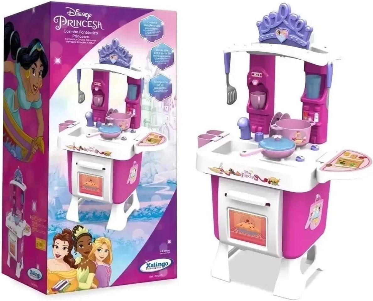 a Cocina Fantástica de Princesas Disney de Xalingo Brinquedos presenta un diseño único. Es una cocina completa con fregadero, horno y estufa, además de una perilla giratoria y una puerta de horno que se abre. Las pegatinas de princesas completan el diseño y enriquecen la experiencia de juego. Los accesorios incluyen ollas, platos, vasos, tazas y cubiertos. Este producto, parte de la línea de juegos de simulación, estimula la imaginación y ayuda al desarrollo infantil. Recomendado para niños a partir de 3 años, ayuda a desarrollar normas de conducta, valores y actitudes que reproducen situaciones familiares cotidianas.
