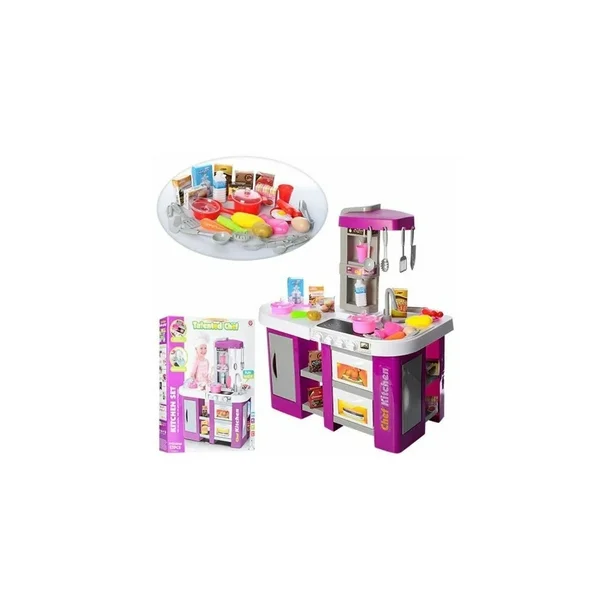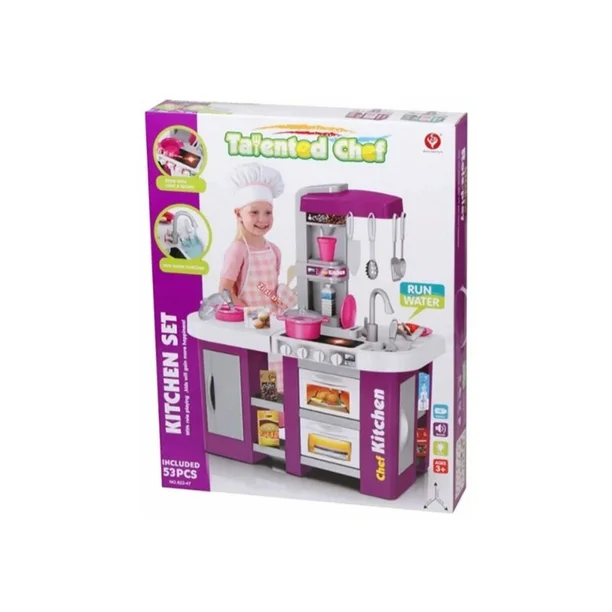 Contiene 53 accesorios, utensilios de cocina, productos de supermercado Ademas contiene: frutas y verduras y otros productos de comida Los accesorios y el producto son de plastico Con panel para colocar utensilios El lavabo emite agua de verdad (se debe llenar manualmente) Emite vapor en la parrilla que se activa con 1 botón, al mismo tiempo emite luz y sonidos de cocion Incluye melodias Requiere 3 pilas AA (no incluidas) Dimensiones ensamblado : A