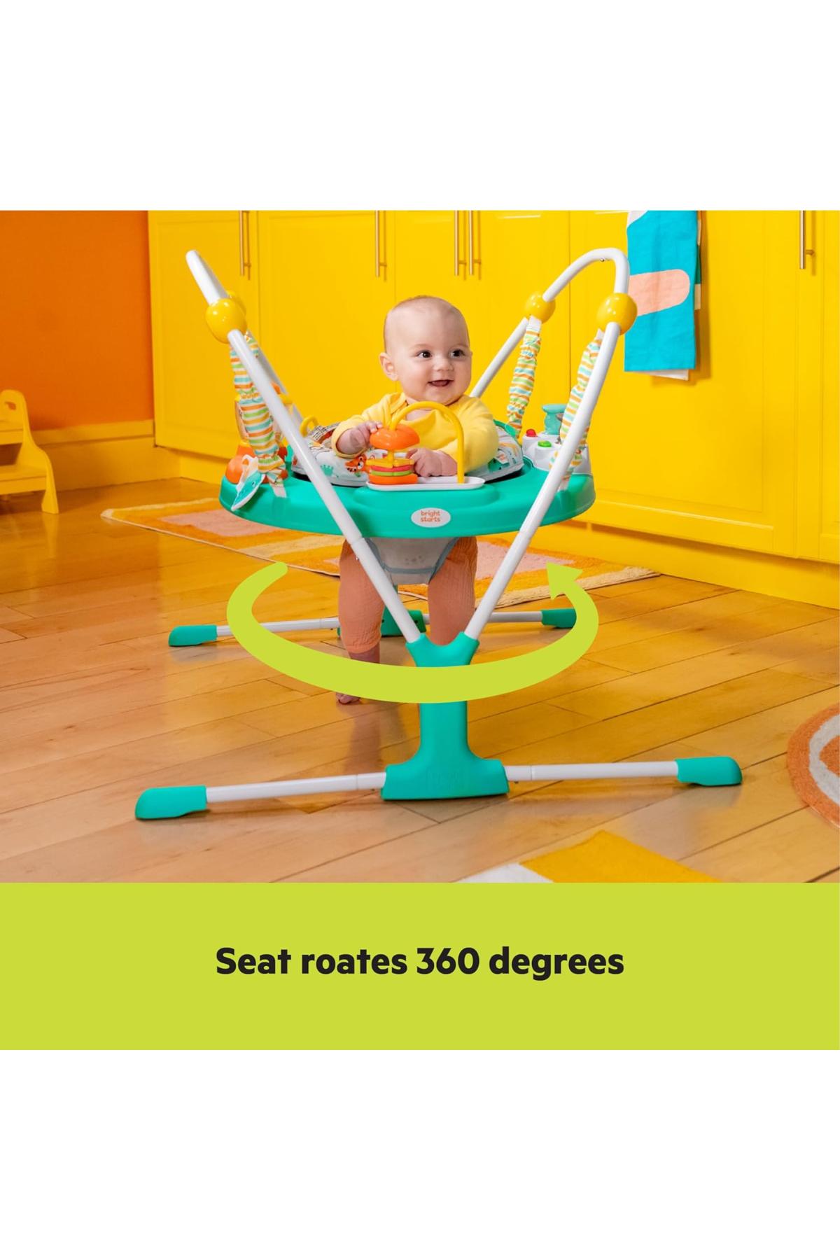 El asiento gira 360° para acceder fácilmente a todas las actividades mientras el bebé salta y juega; la almohadilla del asiento lavable a máquina es fácil de quitar; limpie los juguetes con un paño con agua y jabón suave.