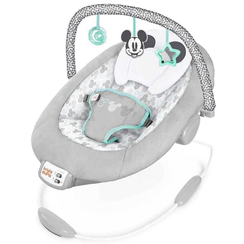 un respaldo reclinable en 2 posiciones. La vibración calma a tu bebé, y la barra de juguetes con Mickey Mouse entretiene con un