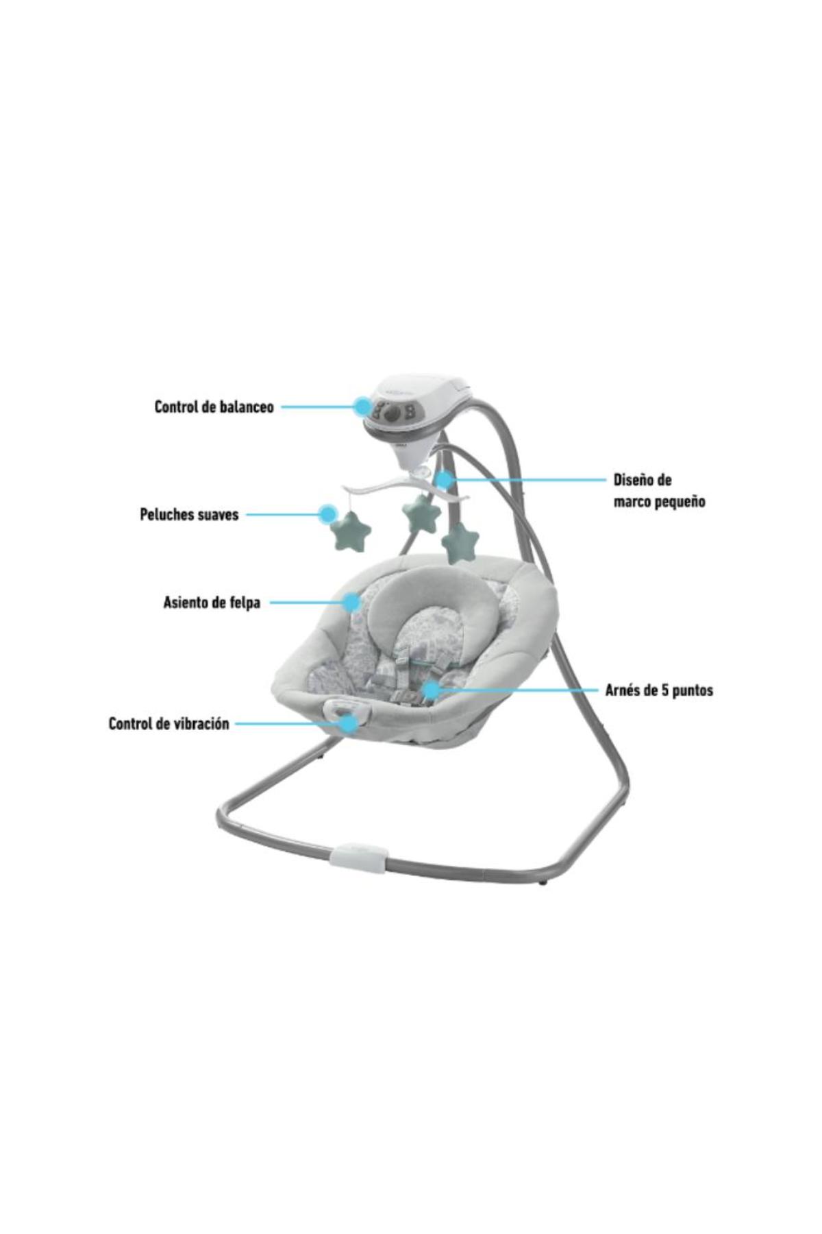 sonajero y un perseguidor de cuentas. Cuenta con un arnés de 5 puntos para mayor seguridad y su almohadilla es removible y