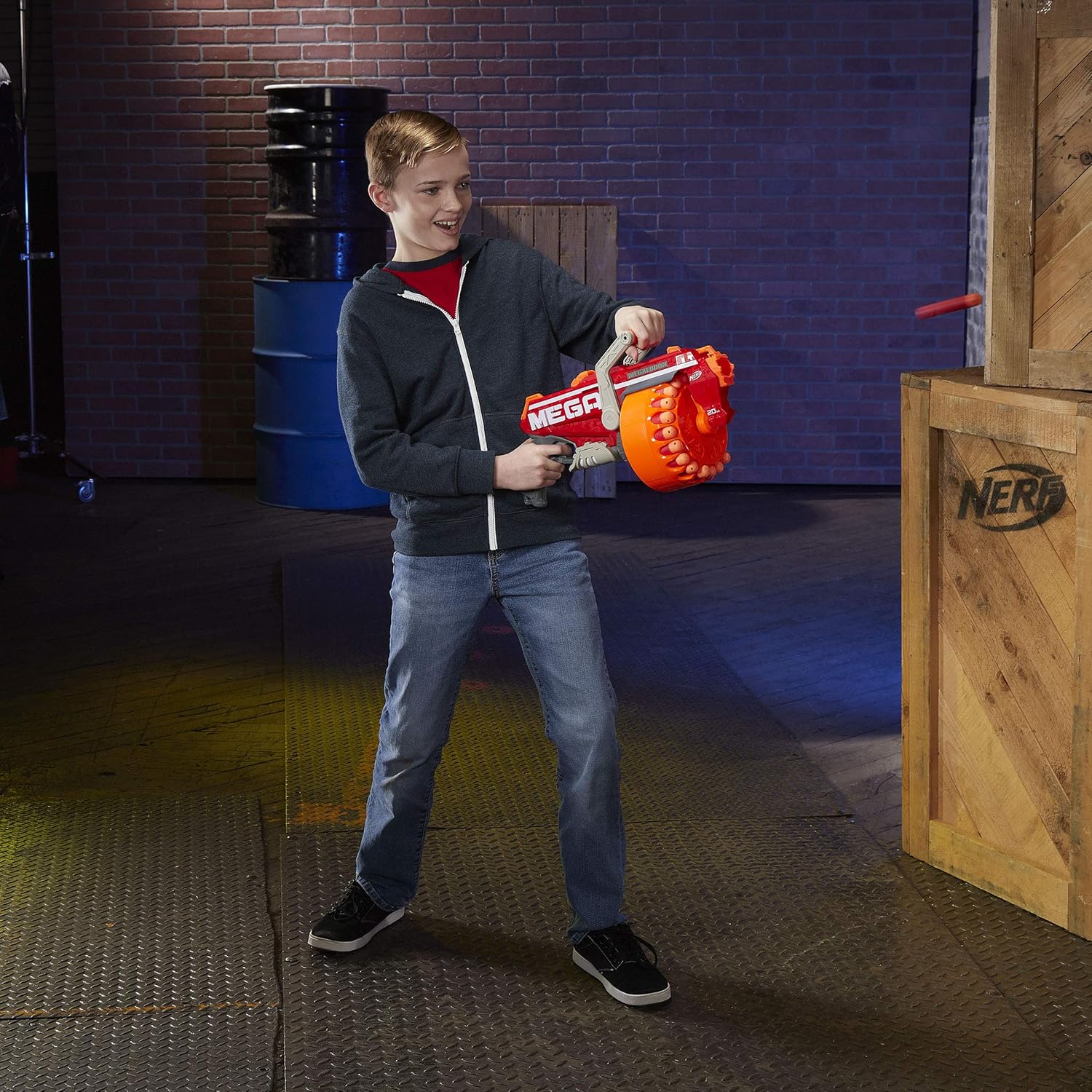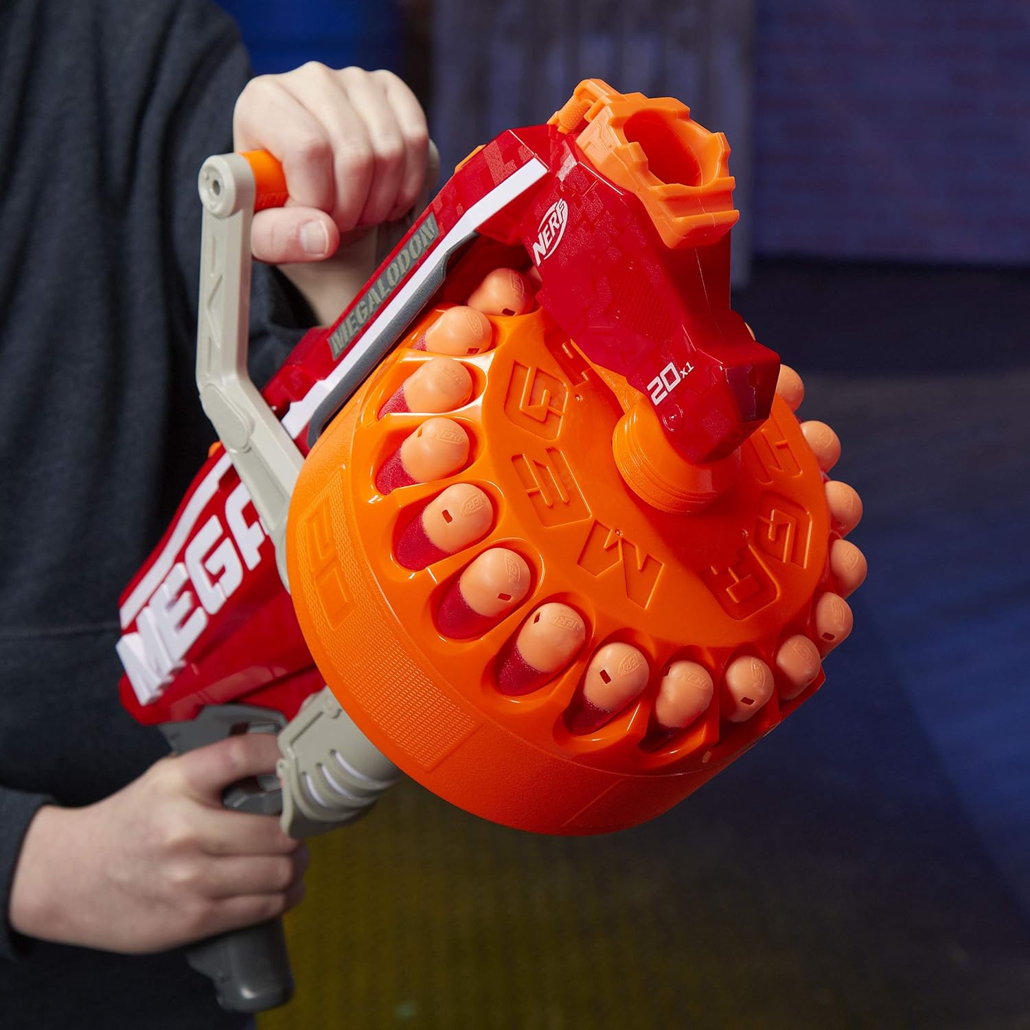 Gire la manija hacia adelante y hacia atrás en este gran lanzador de juguete rojo para enviar 20 dardos NERF Mega en fila silbando por el aire.
