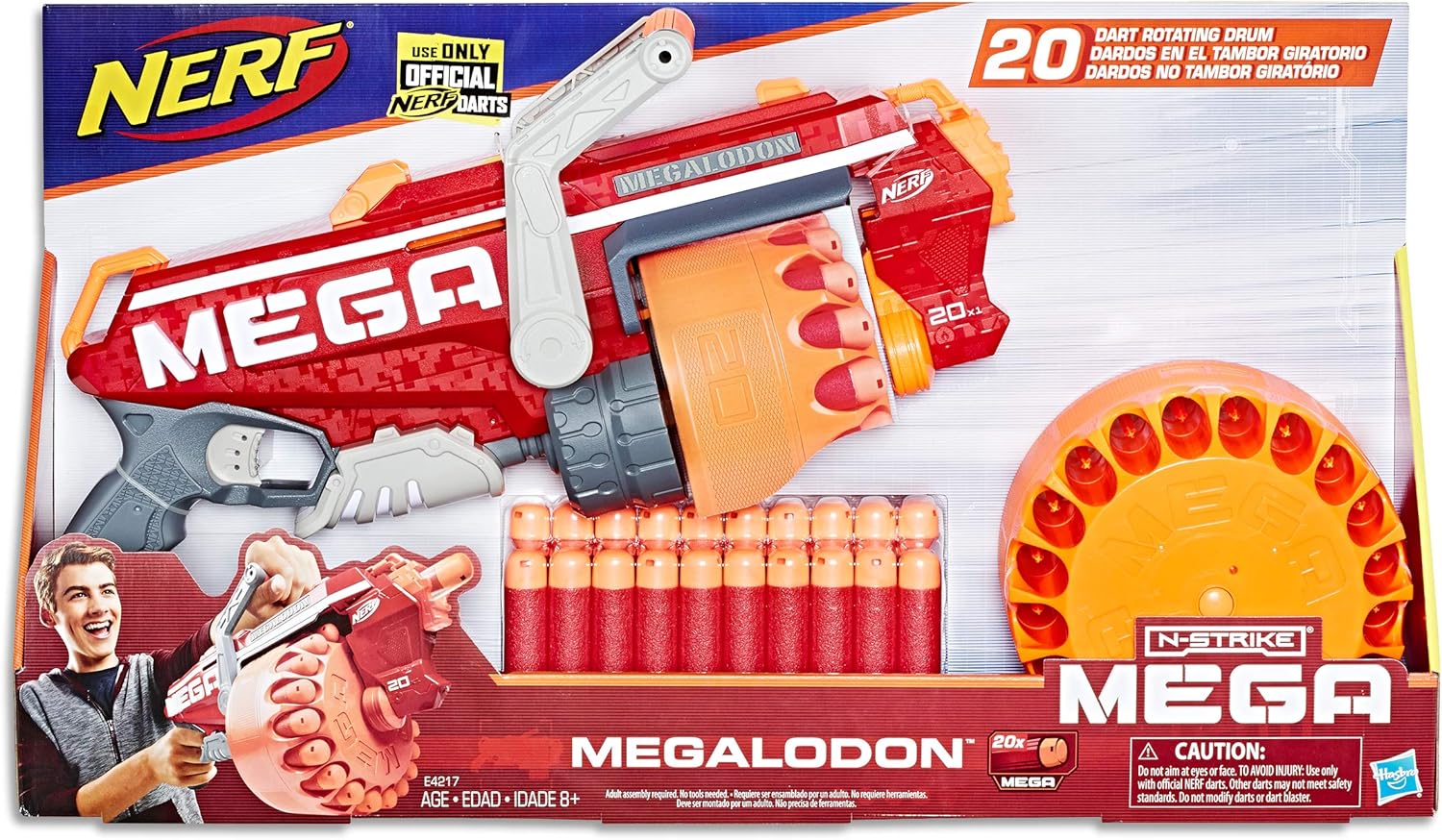 El juguete incluye: lanzador NERF Mega Megladon, tambor de 20 dardos, 20 dardos Mega e instrucciones.