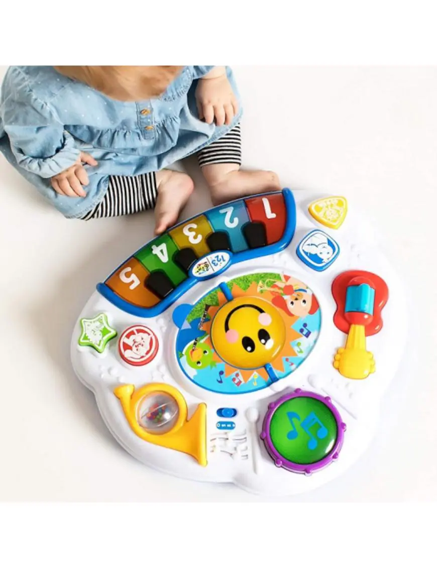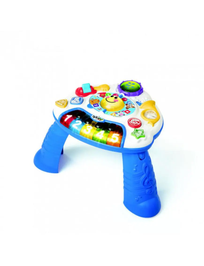 MESITA DE ACTIVIDADES 2 EN 1 DISCOVERING MUSIC – La guitarra,tambor, y la bocina giratoria aseguran que su pequeño compositor se divierta explorando instrumentos. Las teclas del piano enseñan números y colores. En el centro de la mesa, un libro de música está listo para que su bebé voltee la página y active melodías, luces y modos de descubrimiento. La mesa de desarrollo musical crece con su bebé es ideal para jugar en el piso sin las patas para bebés más pequeños o colocar las patas para ponerse de pie y jugar al descubrimiento. Cambiar entre 3 idiomas (inglés, español, francés). Adecuado para niños de 6 a 36 meses. Dim: 38.1 cm x 11.4 cm x 41.9 cm. Edad: 6 a 36 meses