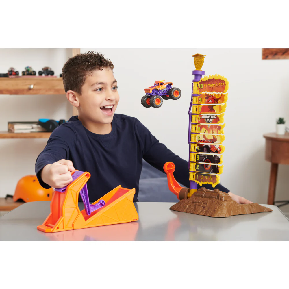 Mnj Playset Toro Loco Big Air Challenge DESAFÍO EL TORO LOCO 50 CM DE ALTURA: Dirige tus camiones monstruo Monster Jam Coches de Juguetes a la cúspide de 50 cm para obtener tantos puntos como puedas; cuanto más alto llegues, más puntos ganarás RÉPLICAS AUTÉNTICAS MONSTER JAM: Domina el escenario Desafío El Toro Loco Monster Jam con el camión El Toro Loco a escala 1:64 de metal. El coche de juguete cuenta con más detalles y diseños del mundo real, llevando las auténticas réplicas de los coches monster truck de Monster Jam directamente a tu puerta LANZADOR INCLUIDO: Este juego de carreras cuenta con más de 5 posiciones en el lanzador, apunta a la cúspide y no dejes que nada te detenga mientras disfrutas con este juego de acción explosiva de Monster Jam. Llega hasta arriba para ver el espectáculo de fuegos artificiales BTK MONSTER JAM: Con los neumáticos BKT oficiales te sentirás como si estuvieras en la pista de coches de verdad. La serie de metal a escala 1:64 trae toda la emoción de Coches Monster Jam directamente a tu hogar. ¡Ideales juguetes niños 3 años, juguetes niños 4 años y amantes de los coches de juguetes llenos de aventura INCLUYE: 1 coche Monster Jam 1:64, 1 panel con los objetivos, 1 lanzador, 1 hoja de calcomanías, 1 guía de instrucciones JUGUETES PARA NIÑOS 3 AÑOS +: Los camiones monstruo Monster Jam están diseñados para niños y niñas a partir de 3 años. Los juguetes, escenarios, coches y camiones por control remoto de Monster Jam son los primeros en la lista de deseos de juguetes y juegos de los más pequeños