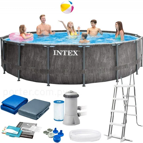 - Piscina circular Intex Prism Frame con PVC de triple capa SUPER-TOUGH™ y acero tratado resistente al óxido y a la corrosión.