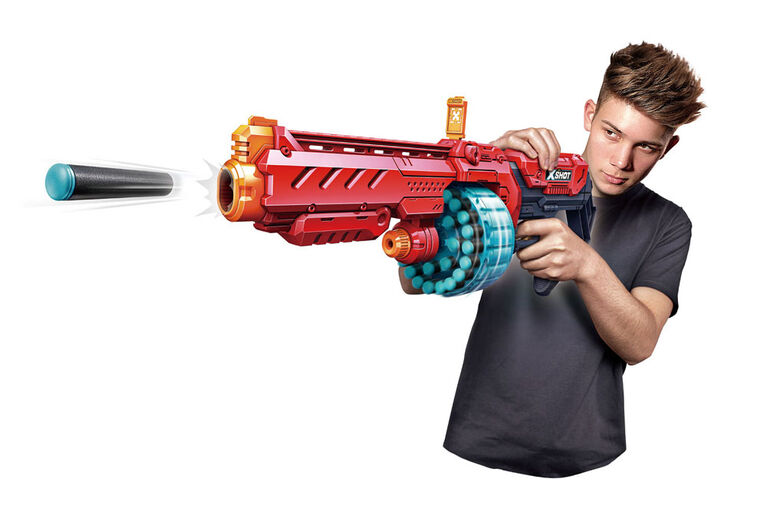 El X-Shot Excel Turbo Fire es la respuesta a todas las expectativas en cuanto a blásters. Combina potencia de fuego, velocidad y precisión en un solo bláster. Dispara 20 dardos en segundos con Slam Fire o elimina a tus oponentes hasta a 27 m (90 pies) de distancia gracias a su mira retráctil incorporada. Este bláster te permite disparar con precisión a tus oponentes a distancia o desatar una lluvia de dardos infernal en espacios reducidos.